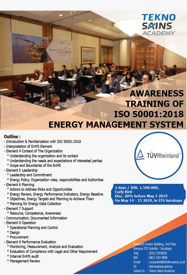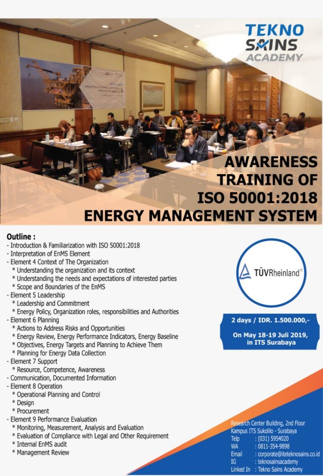 Pada tanggal 29 Mei 2019 dan 31 Mei 2019, Tekno Sains Academy yang merupakan anak perusahaan PT ITS Tekno Sains yang bergerak di bidang Pelatihan dan Sertifikasi sukses mengadakan pelatihan tentang Awareness Project Management dengan Perusahaan Produsen Atap Tanpa Sambungan. Diharapkan para pegawai perusahaan mampu mengenal dan menerapkan prinsip-prinsip manajemen proyek dalam pengendalian pelaksanaan proyek…