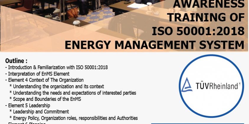 Dalam pelatihan ini, Tekno Sains Academy bekerja sama dengan TUV Rheinland Indonesa, sebuah cabang dari perusahaan multinasional yang bergerak di bidang sertifikasi, inspeksi, dan pengujian. Adapun yang dipelajari di pelatihan ini di antaranya adalah: Pengenalan ISO 50001:2018, Interpretasi elemen EnMS, Elemen 4 Konteks Organisasi, Elemen 5 Kepemimpinan, Elemen 6 Perencanaan, Elemen 7 Dukungan, dan Elemen 8 Operasional. Karena dalam pelatihan ini Tekno Sains Academy bekerjasama dengan TUV Rheinland, maka peserta yang mengikuti pelatihan ini akan mendapatkan sertifikat langsung dari TUV Rheinland tersebut.
